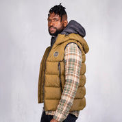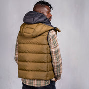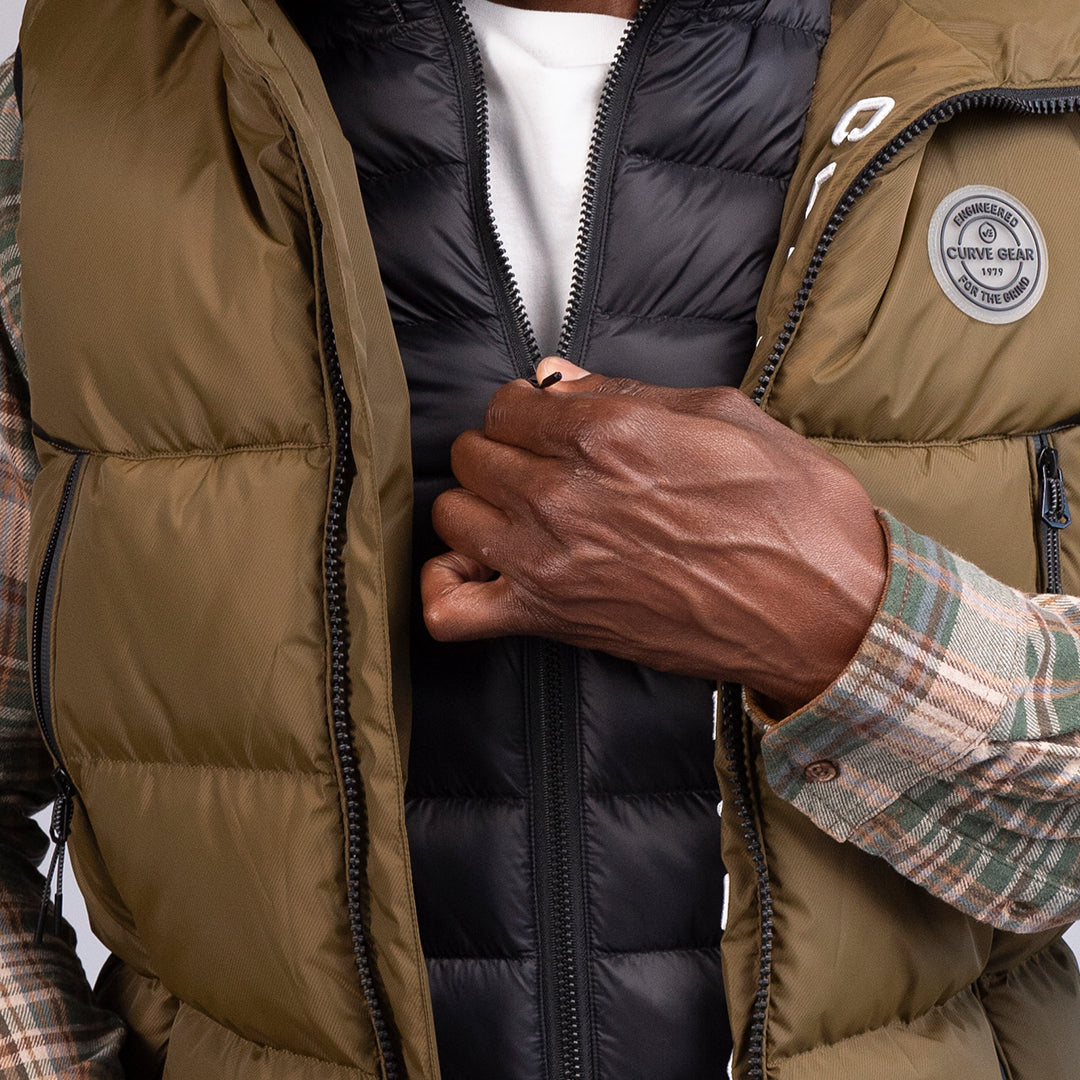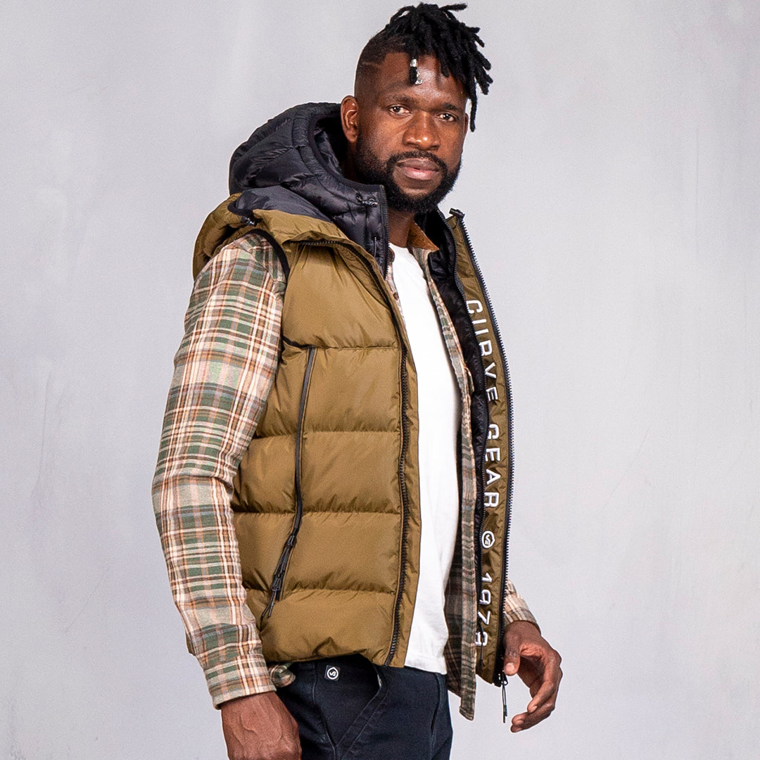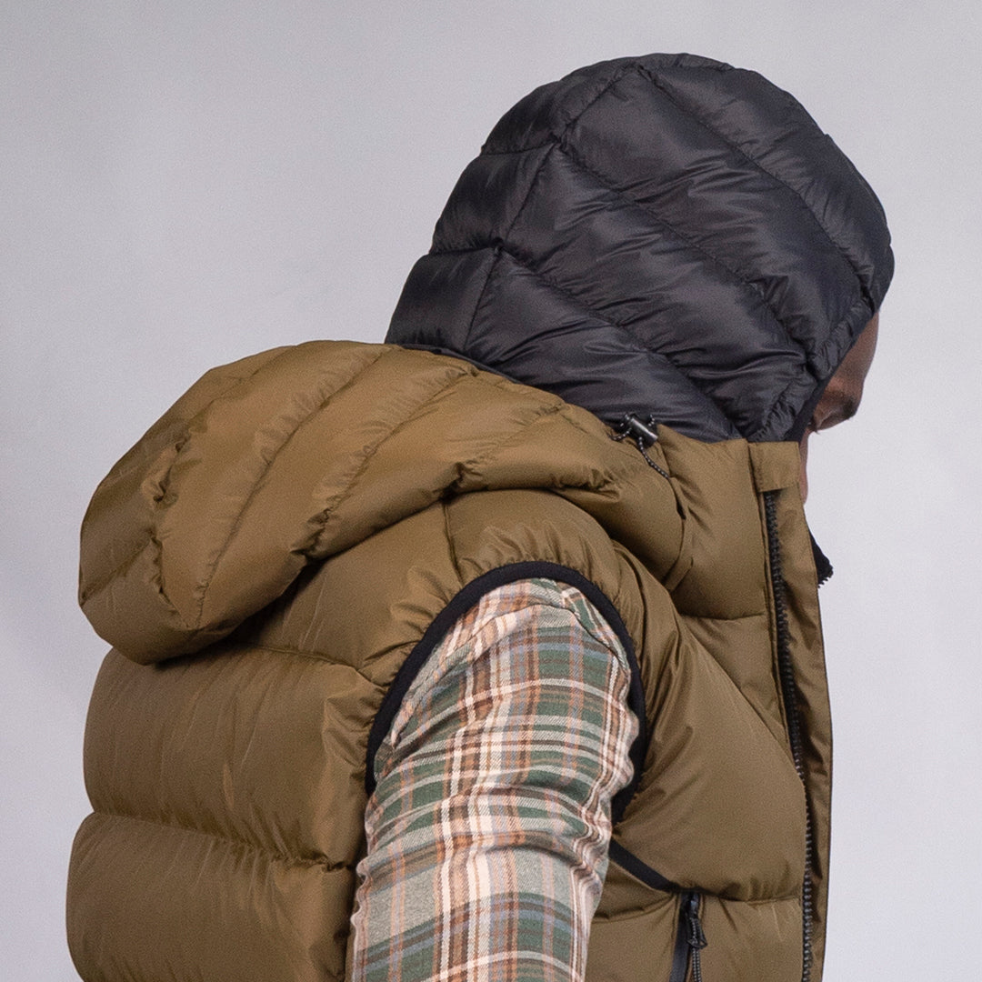 It is a double hooded sleeveless puffer that has four multi-functionable pockets with zips, to secure all your items. The inside pocket can hold a phone.